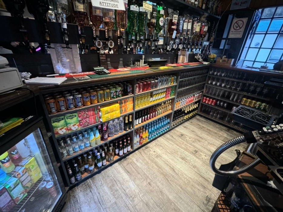 The convenient stock room behind the bar is fully shelved, and there is further bottle storage behind the bar. The commercial Ice machine is conveniently located in the storage room. Staff also have a hand washing sink behind the bar.