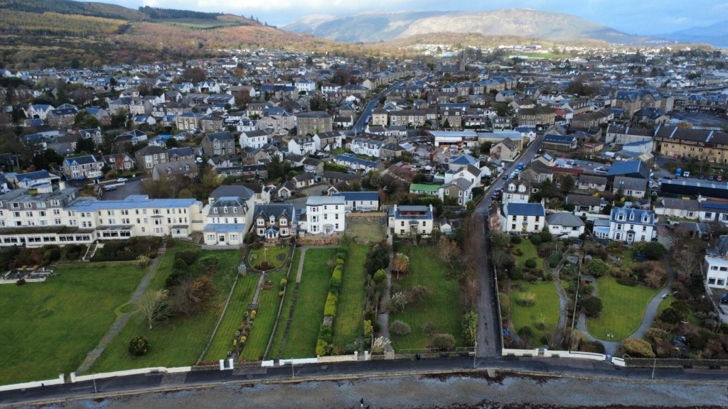 Situated within easy walking distance of the town centre, the site has direct access to the promenade and the beach. Slightly elevated above the well laid out mature gardens, the plot offers uninterrupted sea views South towards the islands of Cumbrae, Bute and Arran.
