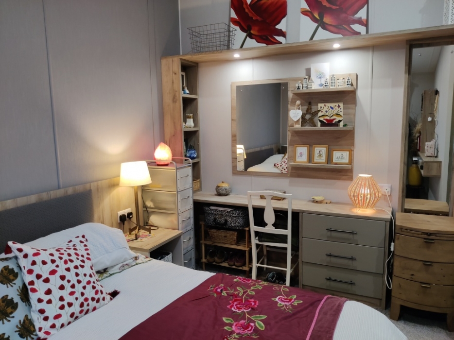 Twin bedroom, window dress area rad fixed wall mounted mirrors