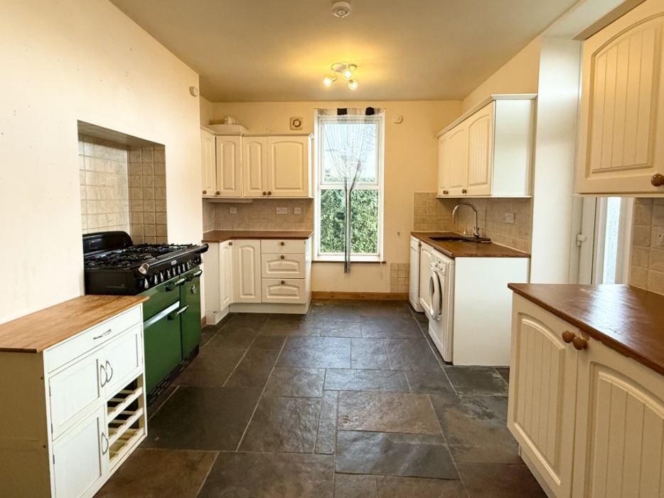 Front door open's to the spacious well fitted out kitchen. Matching base and wall units with contracting work tops. Tiled splash backs. Recess with range master gas cooker . Sink with mixer taps ceramic slate tiled flooring . Window to the side with deep sill. Spot lighting . Door to lounge and door to back hall. Which leads to the 3 bedrooms and family bathroom .