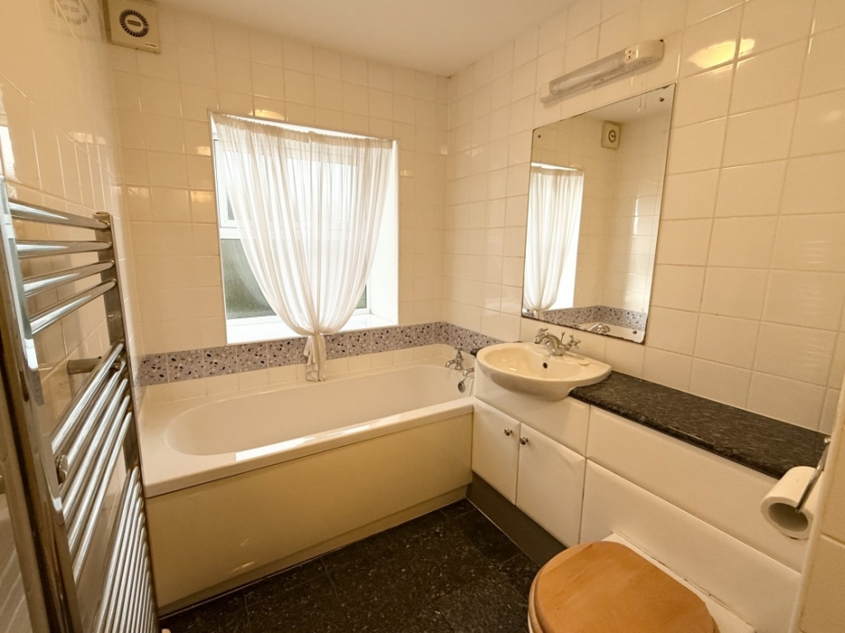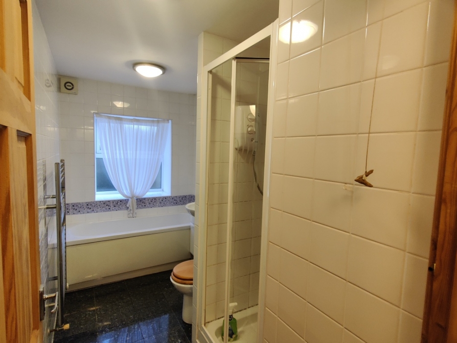W.C wash hand basin on vanity unit with cupboard below . Bath and separate shower enclosure with electric shower. Fully tiles walls and marble effect tiles floor . Window to the side with privacy glass. Chrome towel radiator. Extractor fan. Two ceiling lights .