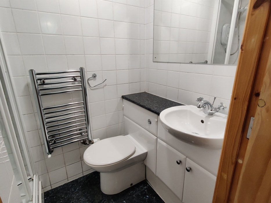W.C and wash hand basin with mixer taps on vanity unit with cupboard below . Walk-in shower enclosure with electric shower and concertina shower door. Chrome towel radiator. Fully tiles walls and floor fitted mirror . Extractor fan light with shaver point.