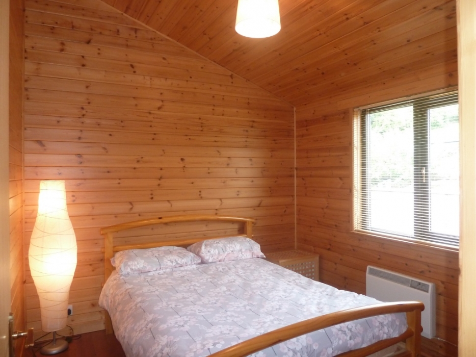 French door to the front leads to the decking. Laminate wood effect flooring. Wall mounted panel heater. Fitted wardrobe with shelving and hanging rails with mirror sliding doors . Fixed dressing table. Pendant light