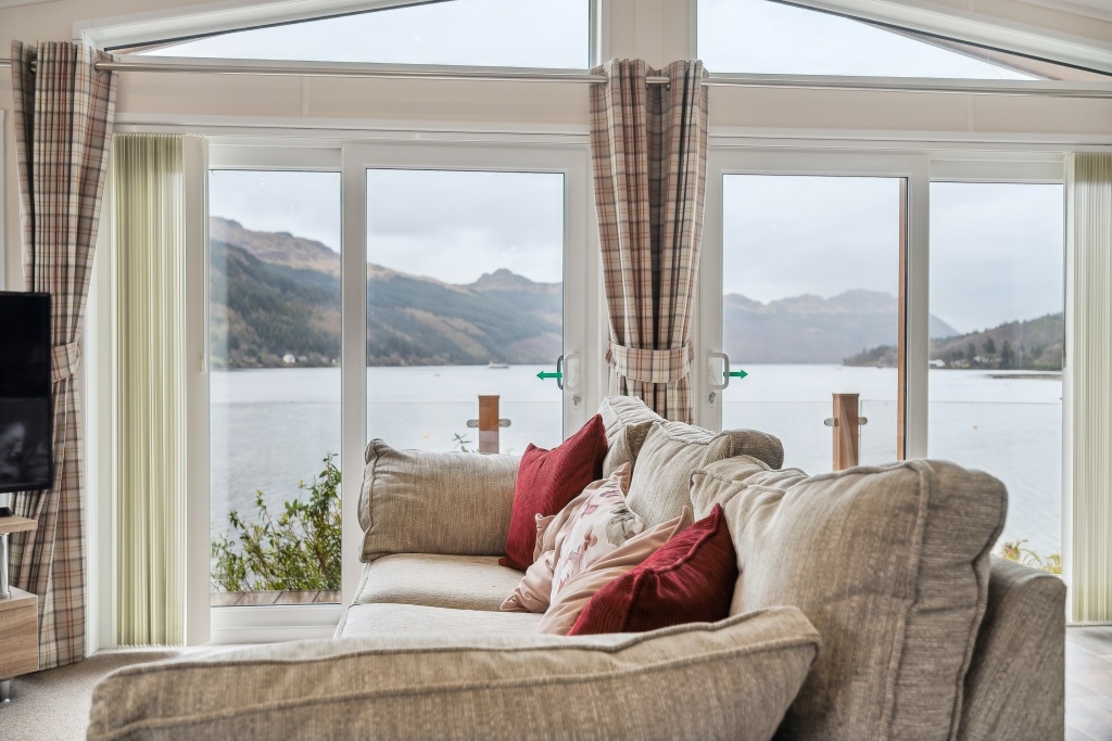 This 40ft x 20ft two-bedroom lodge features an open-plan living area with double sliding doors to the front leading to the generous front decking creating a sense of spaciousness and benefitting from the stunning open Loch Goil views . The living area includes two sofas focal point fire place with inset electric style stove.