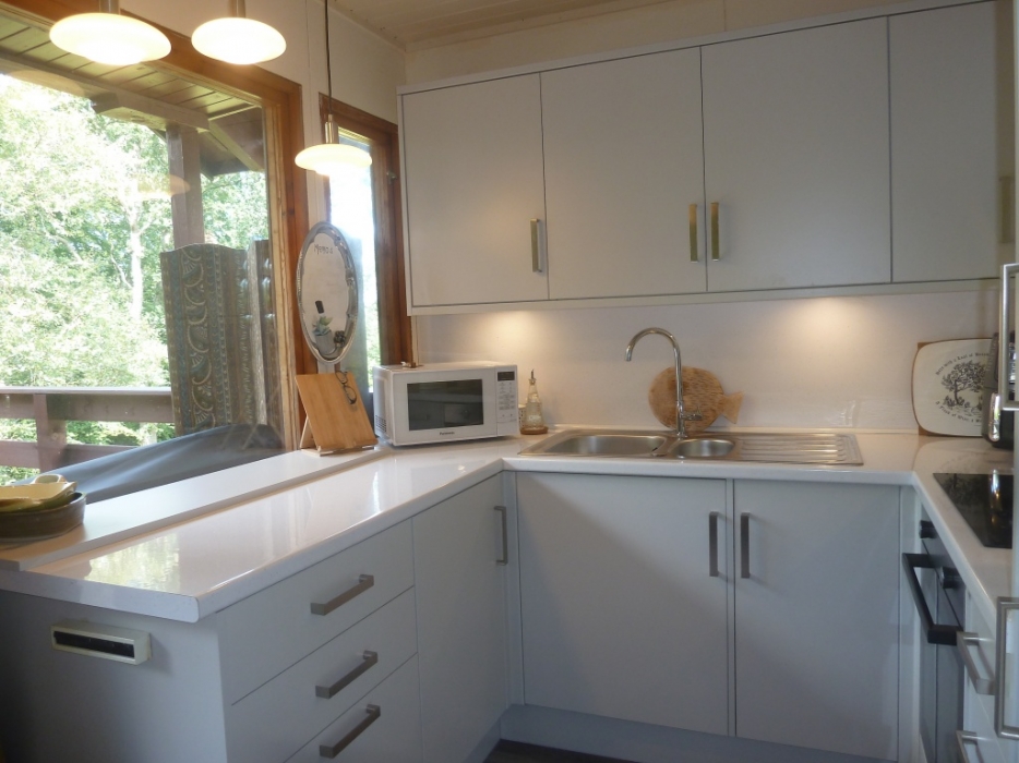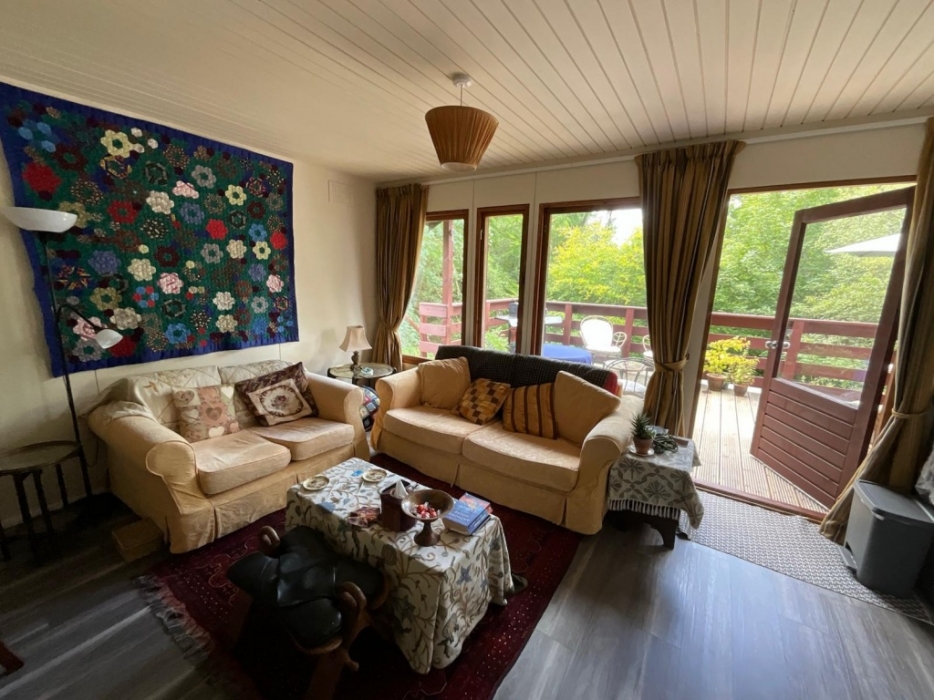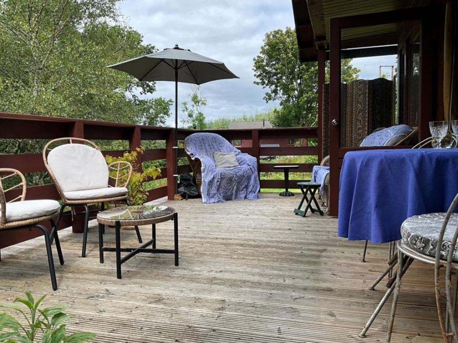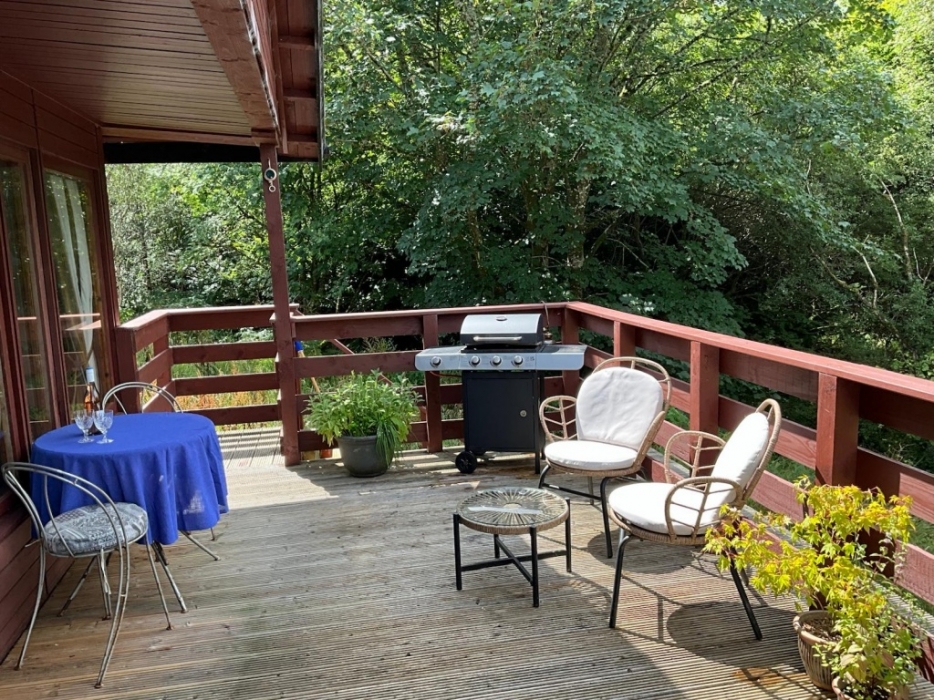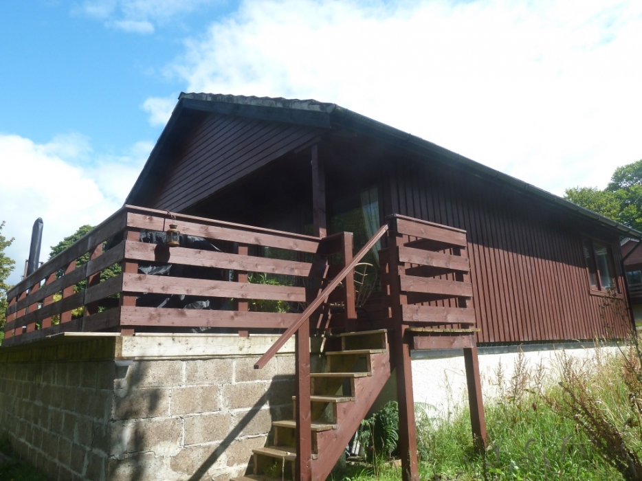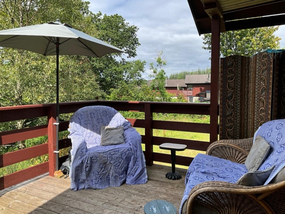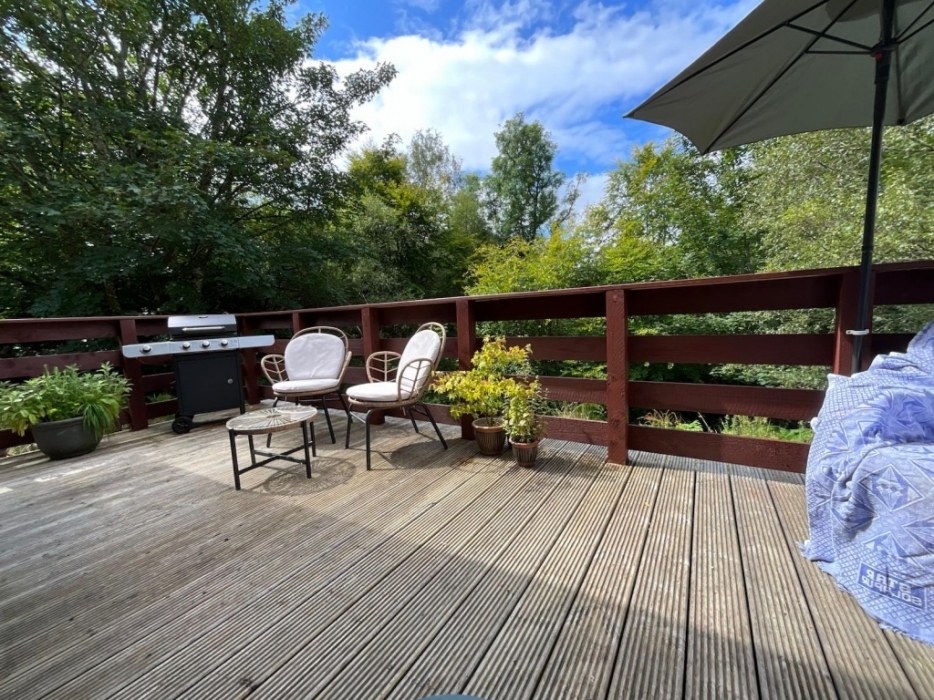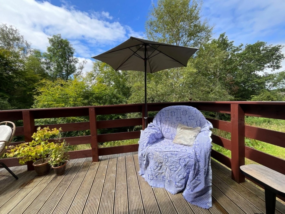 New Decking to the front of the lodge with steps to the front leading to the woods and the beach beyond via the forestry track