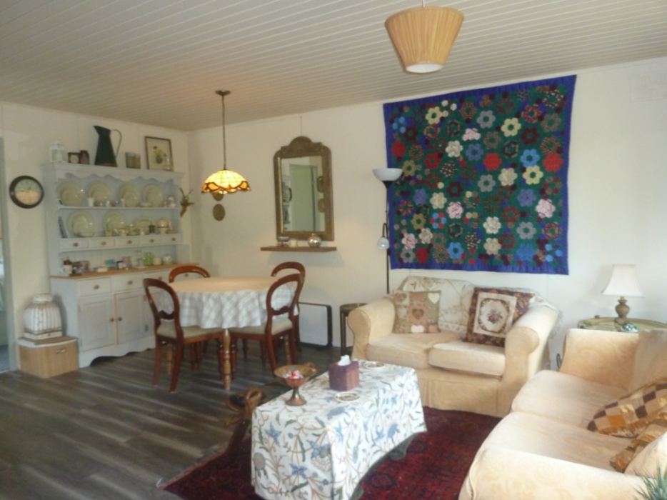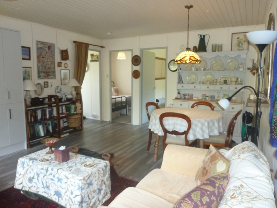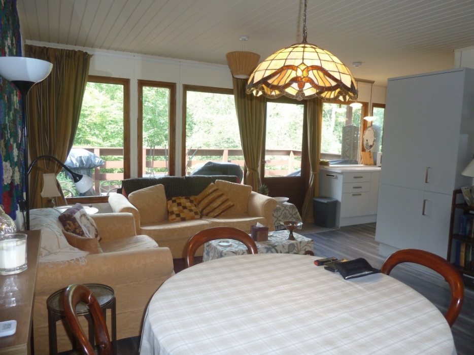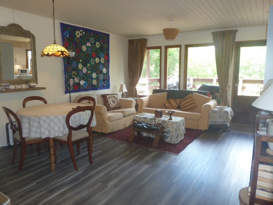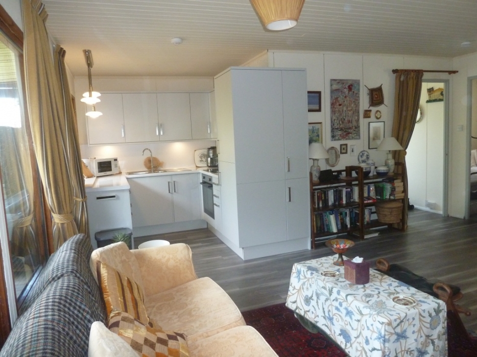 Open plan bright and spacious lounge kitchen diner with door to the front to the large private decking area, new quality wood effect flooring.