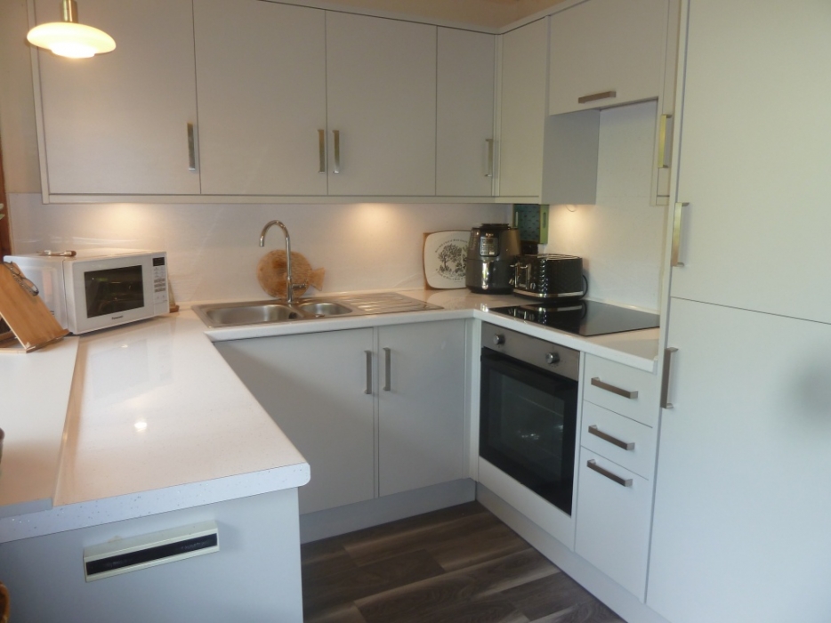Modern professionally fitted kitchen with matching base and wall units with contrasting worktops Stainless steel sink with mixer taps and side drainer. Ceramic hob with oven below integrated fridge freezer. Plenty space for dining table chairs,
