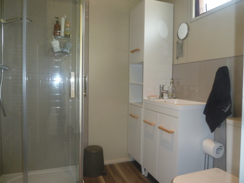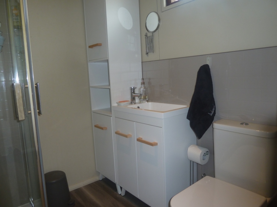 W.C Wash hand basin on vanity unit with cupboard below and shelving. Corner shower enclosure with rain head . Wet wall with in . Heated Towel Radiator. Window with privacy glass to the side, recessed LED lighting. Fixed mirror.