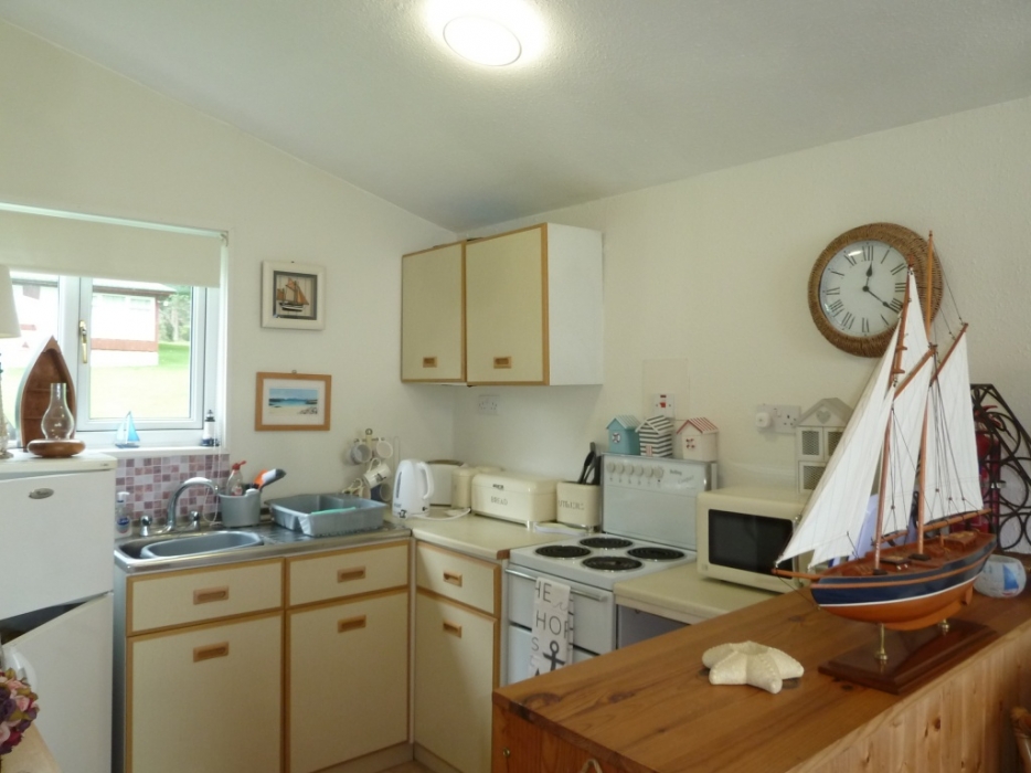 Fitted kitchen with matching base and Wall mounted with contrasting worktops. Stainless steel sink with mixer taps, window to the back. Space for cooker and upright fridge freezer. Space for table and chairs . Breakfast bar finished in pine wood with shelving below . Flush fit ceiling light. Vinyl flooring