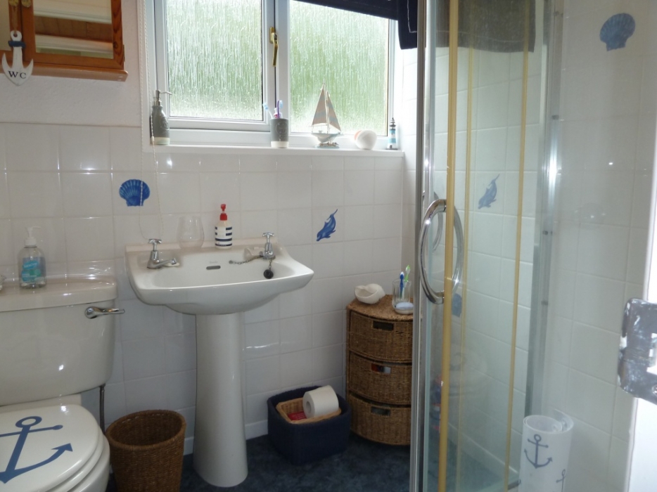 W.C Wash hand basin on pedestal, corner shower enclosure with electric shower. Part tiled walls window to the back with privacy glass heated towel radiator. Hi Grade Vinyl flooring. Ceiling light
