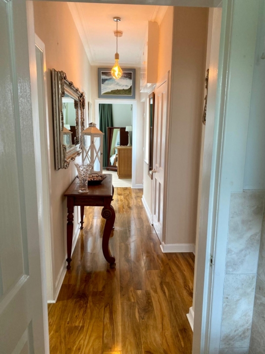 Laminate wood effect flooring radiator pendant light loft hatch access bathroom 3 bedrooms door to front . Hall cupboard with shelving.