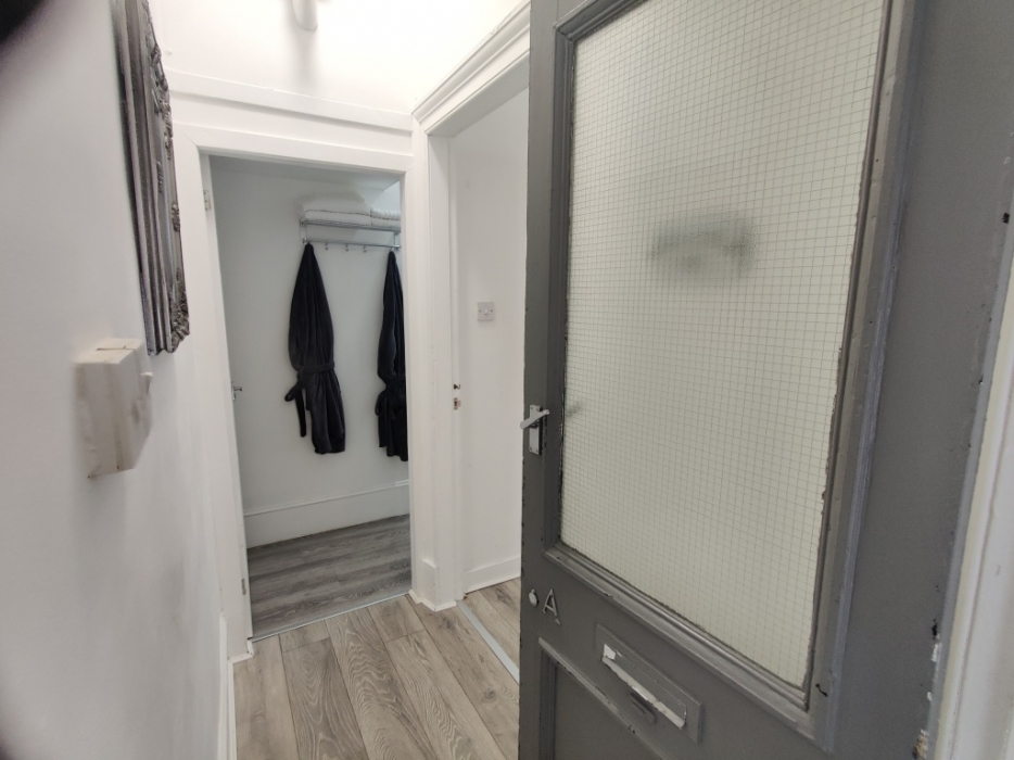 Electric meter located here . Access to the lounge and shower room . Laminate wood effect flooring