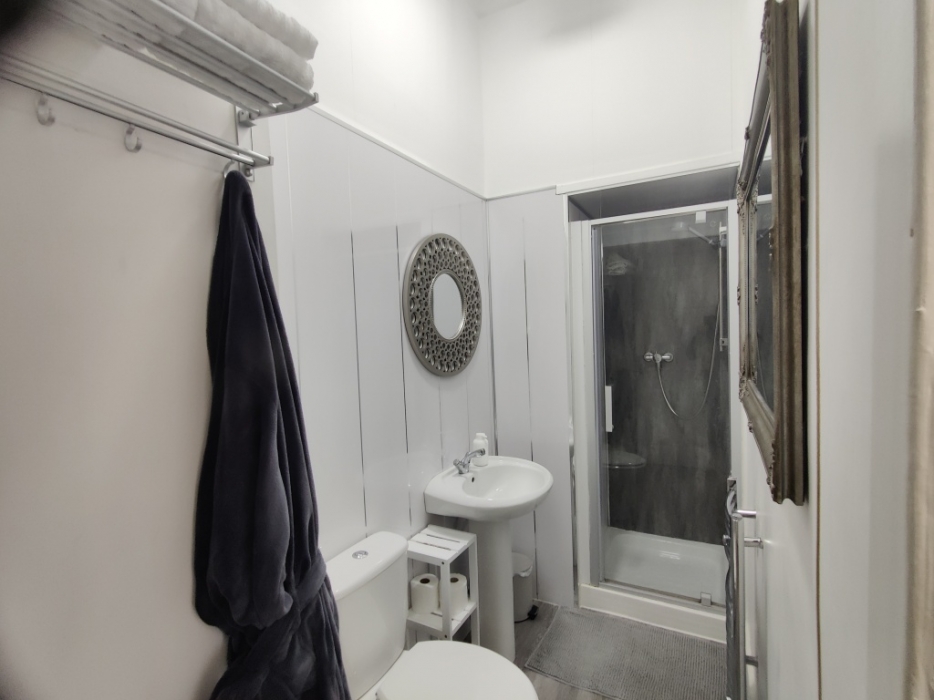 Shower enclosure with wet wall paneling. Chrome towel radiator
