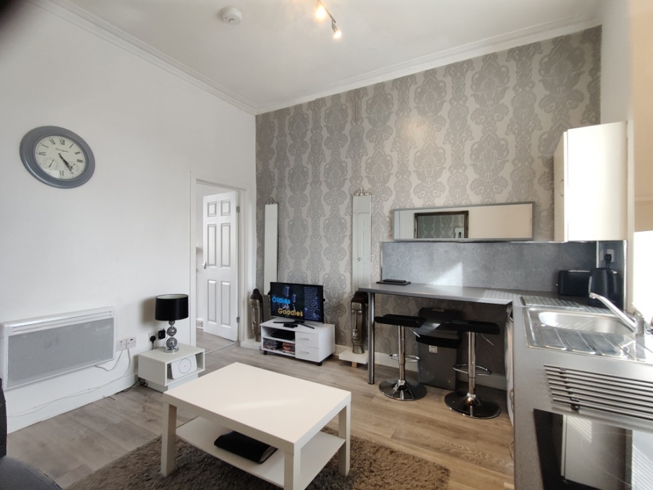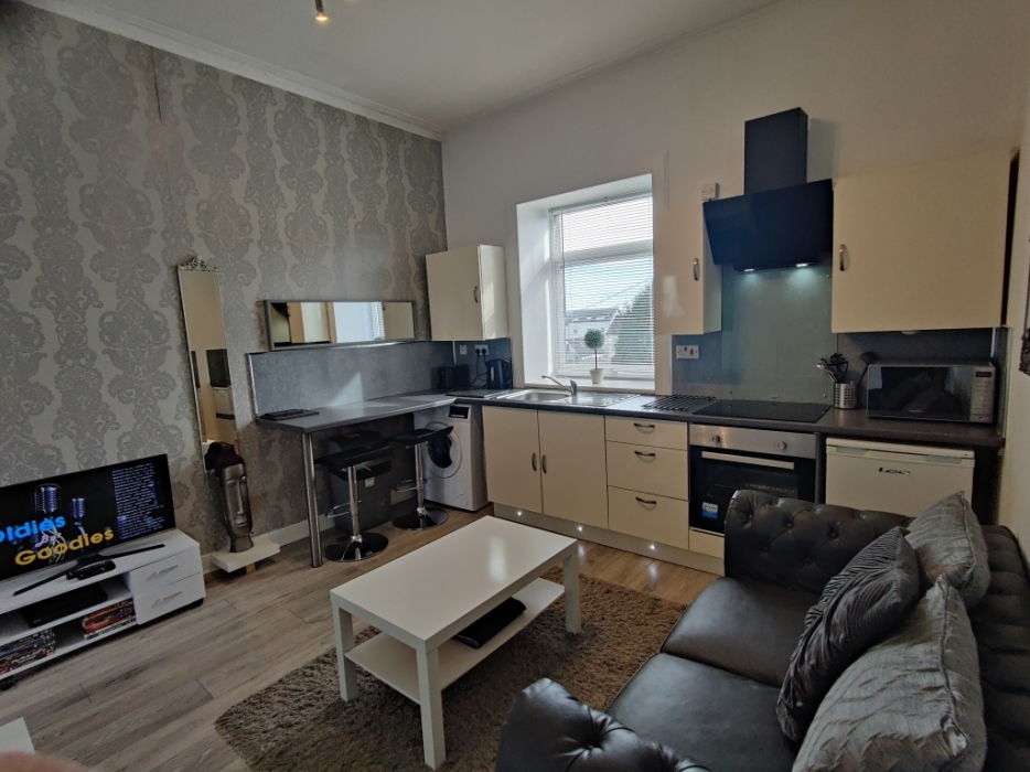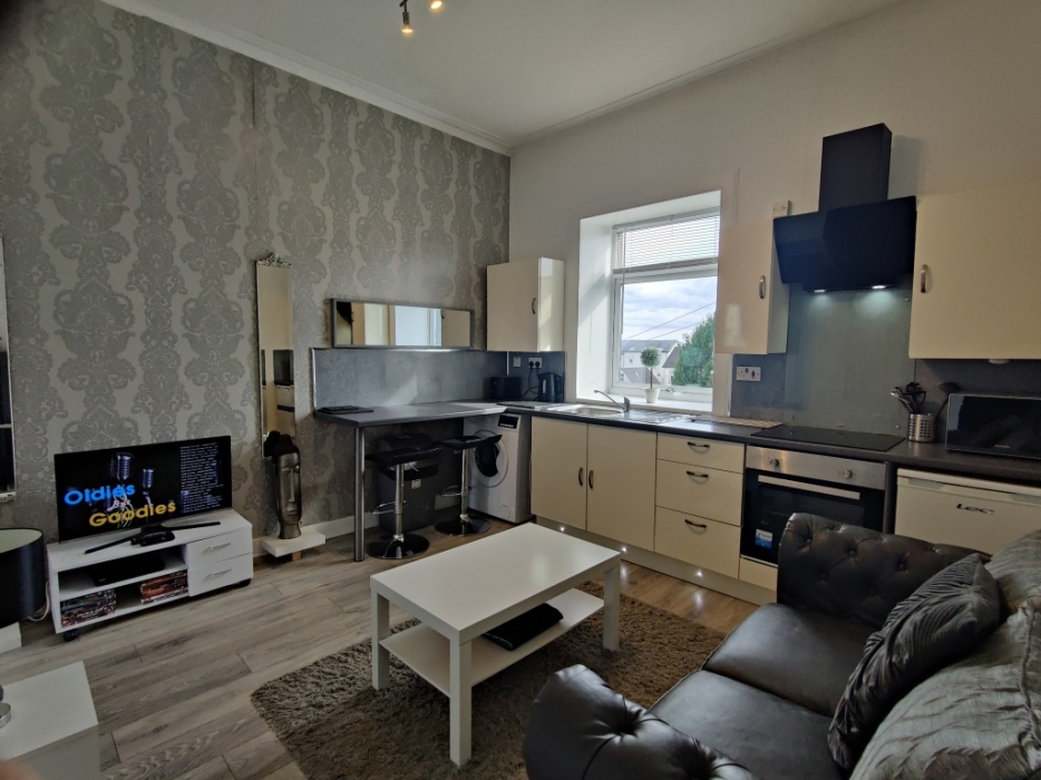 Open plan lounge with fitted kitchen with matching base and wall units with contracting work tops.ceramus hob and oven below. Extractor hood stainless steel sink with mixer taps and side drainer. Matching wall units splash backs. Window to the back which floods the room with natural light. Space for white goods . Breakfast bar laminate wood effect flooring.