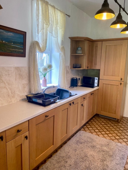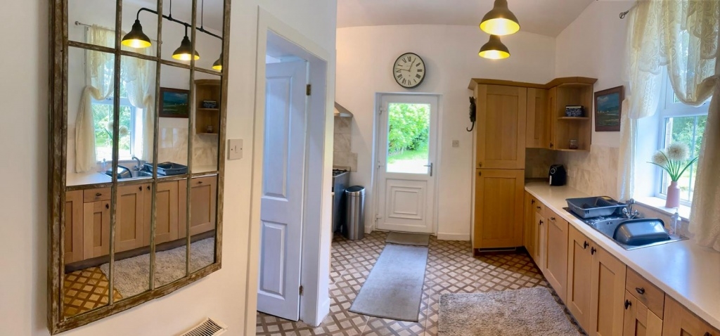 Bright and spacious fitted kitchen with matching base and wall units with contrasting worktops, Stainless steel sink with mixer taps, with window to the side, Ceramic tiled flooring. Pendant lighting Back door leads to the garden. Free standing Gas Range cooker.